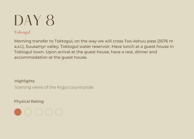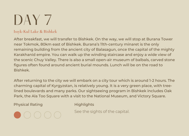 Our journey is overland because we like to keep things as sustainable as possible, so no short flights, instead you'll get to see the diversity of the landscape rolling by, the sheer vastness of the mountains and memorable interactions along the way. From bustling cities like Bishkek to quaint villages like Toktugul where you can connect with your surroundings.